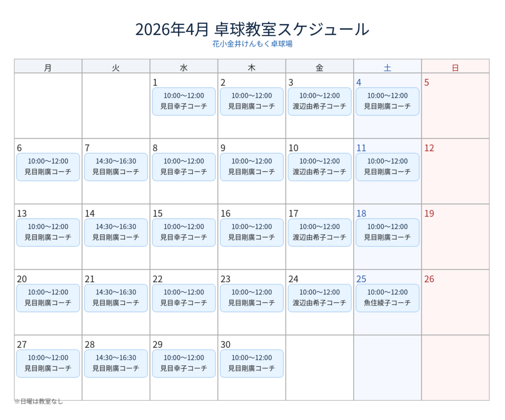2026年4月の卓球教室スケジュールをお知らせいたします。